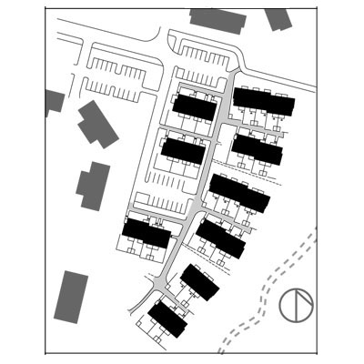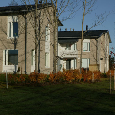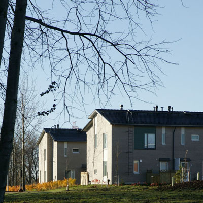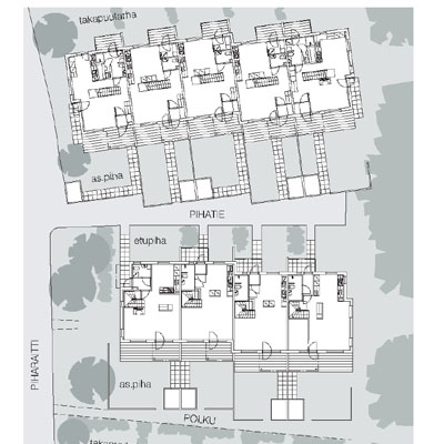 Terraced housing overlooking a small brook. The space between the buildings forms a variety of yard types - spacious south facing yards and entrance courts or private gardens to the north. Two alternative plans were designed for each dwelling.