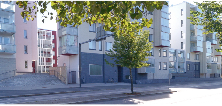 Katujulkisivuissa on vaaleat sävyt ja varioiva parvekesijoittelu, pihajulkisivuissa puolestaan voimakkaat sävyt ja systemaattinen parvekesijoittelu.
