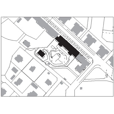 The houses are situated in a newly built district facing an older one-family house area. The first floor apartments are connected to studios on ground level, opening to the street.