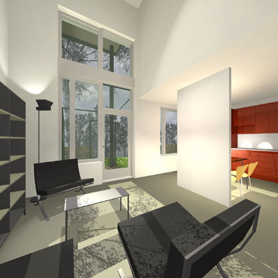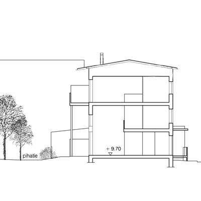 A double height space forms the hearth of the house in the basic unit. The space can be used as living room or kitchen. Private saunas are on the second floor with access to a balcony. The two designed floor plan options are included in the design. Provisions concerning building services are made to make later changes easier from one option to the other.